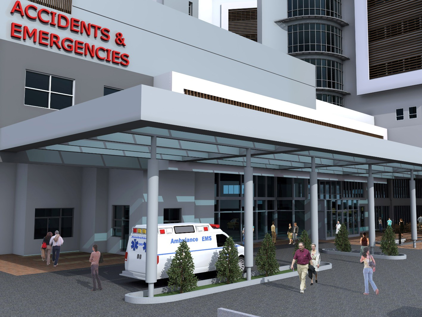 Rawang Specialist Hospital- a multi-story medical facility is located in Malaysia. Designed by architect Nia, our director was the project designer for the facade. The building features a modern design with a facade predominantly in white, gray, and green colors. The structure includes large windows, horizontal and vertical elements, and a clear, organized layout. The entrance area for accidents and emergencies is prominently marked in red text, with an ambulance and several people visible in the vicinity. The overall architectural style reflects a contemporary and functional design approach.
