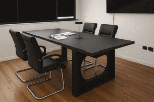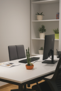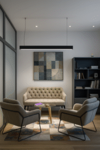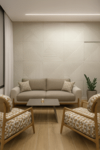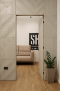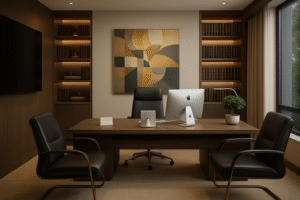 Soicorum offices are located at Tirana Industrial Park. The total area is 900 m², comprising the directorate, admin, meeting room, and service facilities. This office embraces a minimalist elegance, blending warm wood tones, soft lighting, and geometric art to create spaces of calm focus and refined professionalism. Each environment—whether executive desk, lounge, or meeting area—balances comfort with modern sophistication, emphasizing natural textures, symmetry, and a serene atmosphere ideal for thoughtful work and dialogue.